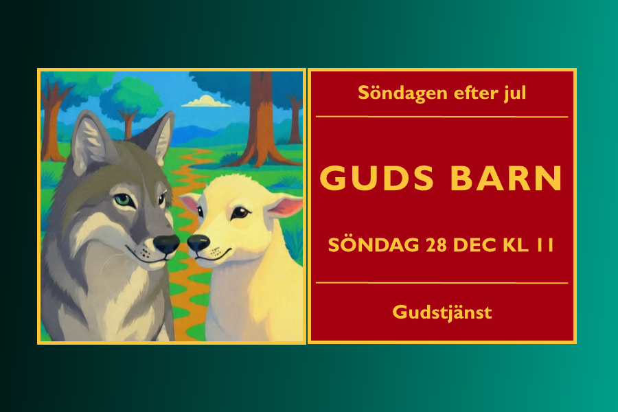 Söndag 28 december kl 11 "Då skall vargen bo med lammet" Tema: "Guds barn" Predikan: Stefan Albinsson Orgel: Cecilia Thomsson Fredrik Annby läser Tennysons "Nyårsklockan" Nattvard...