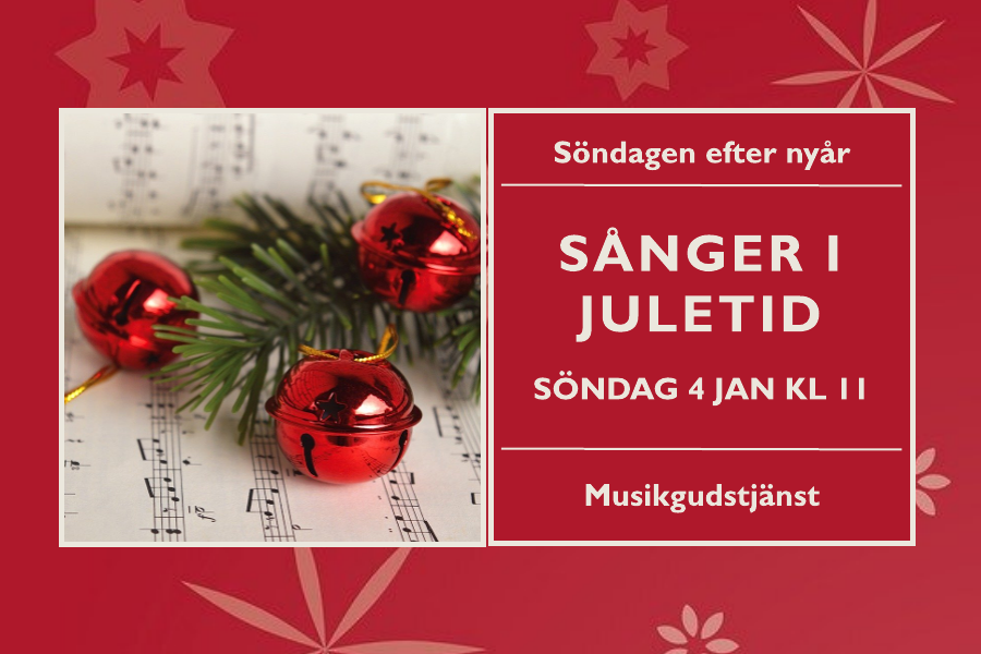 Söndag 4 januari kl 11 "Nu jublar min själ och min kropp" Musikgudstjänst: "Sånger i juletid" Tema: "Guds hus" Predikan: Eva Larsen Sång: Malin Hilding Piano: Axel Simerov Nattvard...